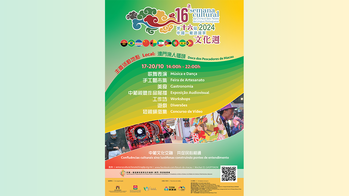 由中國—葡語國家經貿合作論壇(澳門)常設秘書處主辦的第十六屆中國-葡語國家文化週於今年10月17日至20日假澳門漁人碼頭勵駿大道隆重舉行,匯聚來自中國以及安哥拉、巴西、佛得角、幾內亞比紹、赤道幾內亞、莫桑比克、葡萄牙、聖多美和普林西比、東帝汶九個葡語國家的文化藝術團隊遠道來澳,一連四日為公眾帶來一系列精彩紛呈的節目。現場將設有中國及葡語國家藝團歌舞表演、手工藝市集、廚藝展示工作坊、葡語國家及澳門產品展銷攤位等。與此同時,葡語國家頂尖大廚將聯手澳門漁人碼頭怡景餐廳,共同打造特色菜單,為賓客呈獻融合葡語國家風味的美饌佳餚。